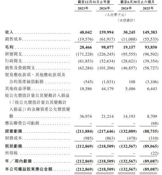 2023年、2024年、2025年1-6月,精锋医疗的收入分别为48.0百万元、160.0百万元、149.4百万元;年/期内亏损分别为212.9百万元、218.5百万元、89.1百万元。