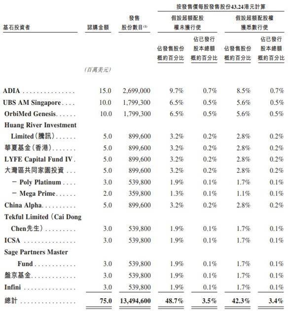 精锋医疗的基石投资者为ADIA、UBS AM Singapore、OrbiMed Genesis、Huang River Investment Limited(腾讯)、华夏基金(香港)、LYFE Capital Fund IV、大湾区共同家园投资、China Alpha、Tekful Limited(Cai Dong Chen)、ICSA、Sage Partners Master Fund、盘京基金、Infini。